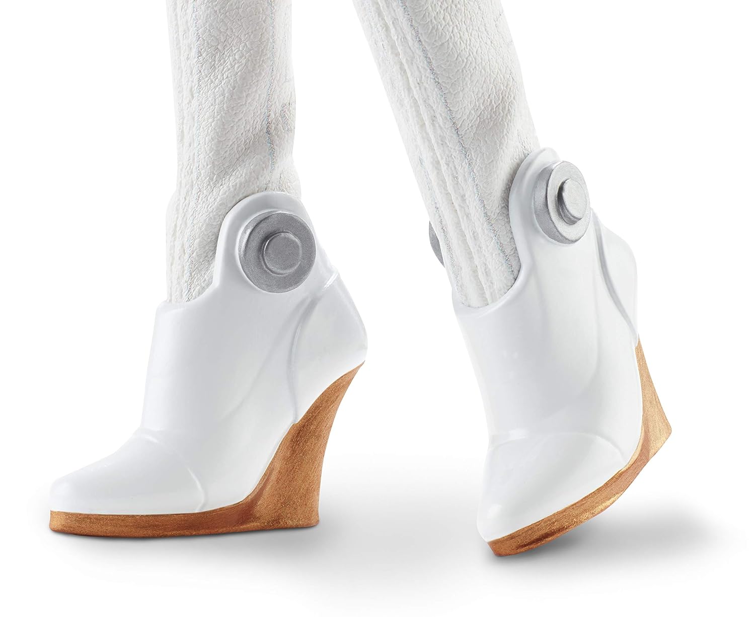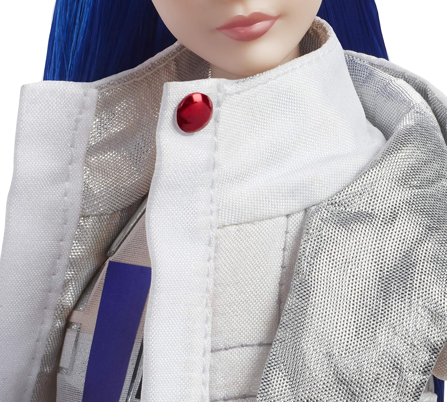 Barbie R2-D2 doll is so cool! She truly captures R2-D2’s droid look in a geometric ensemble with a dome skirt, bomber jacket and thigh-high boots over silvery tights. I like her vibrant blue ponytail and blue eye makeup a lot. She also comes with a C-3PO-gold purse – what a clever idea!