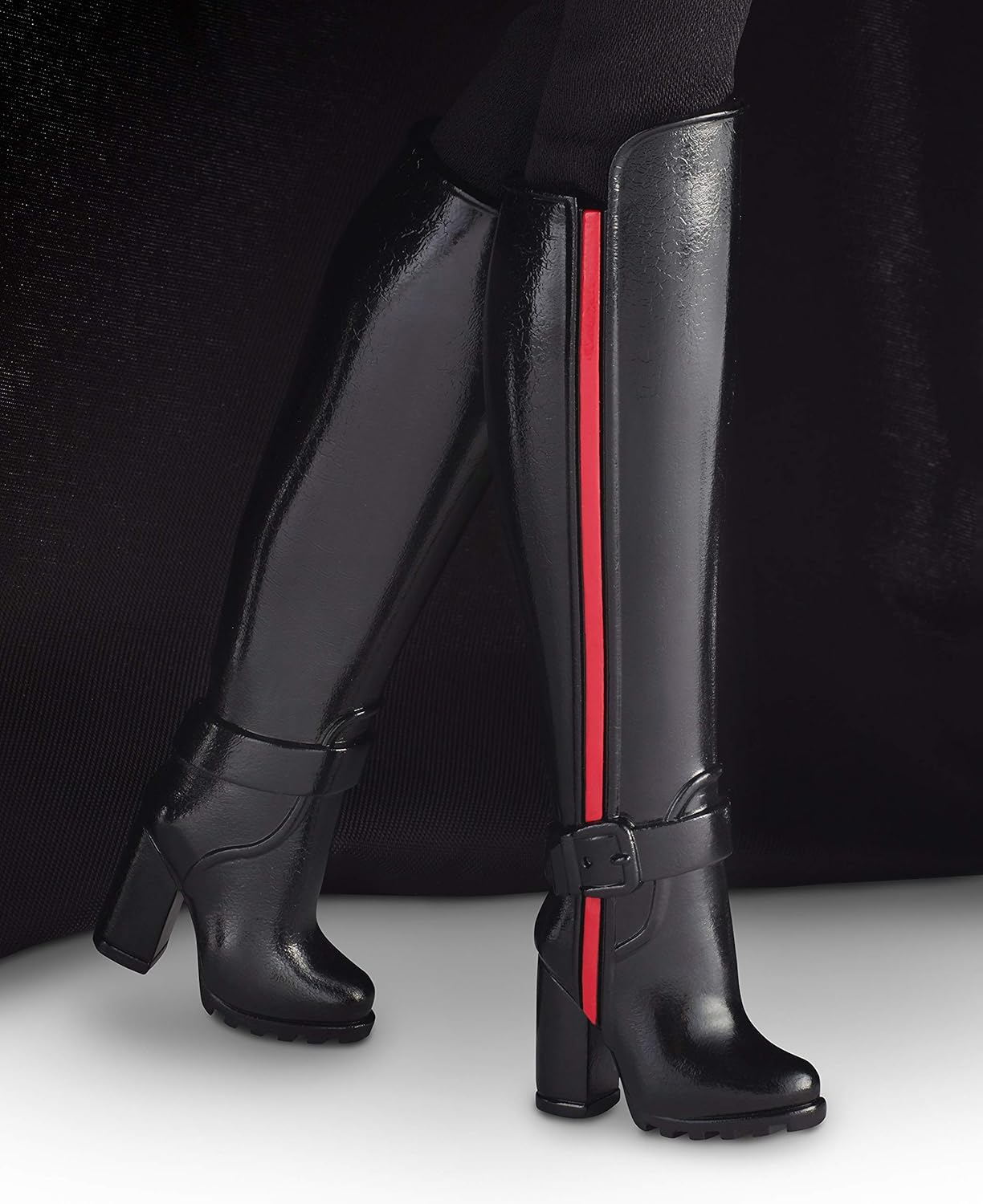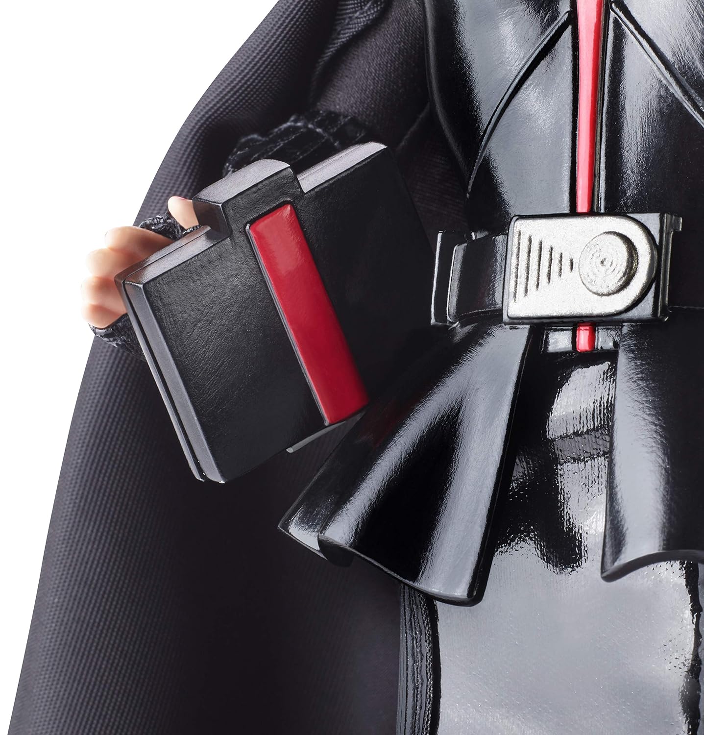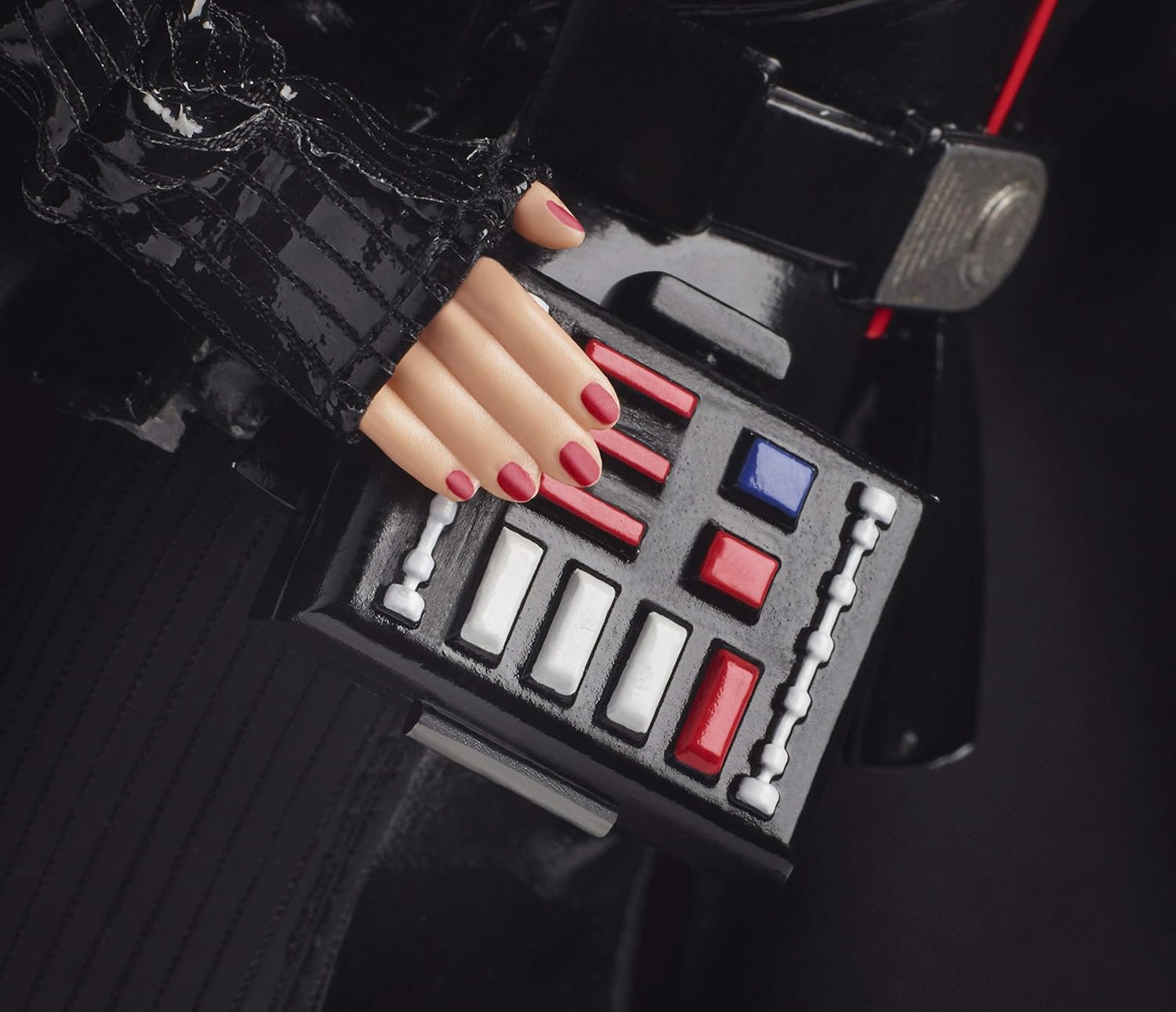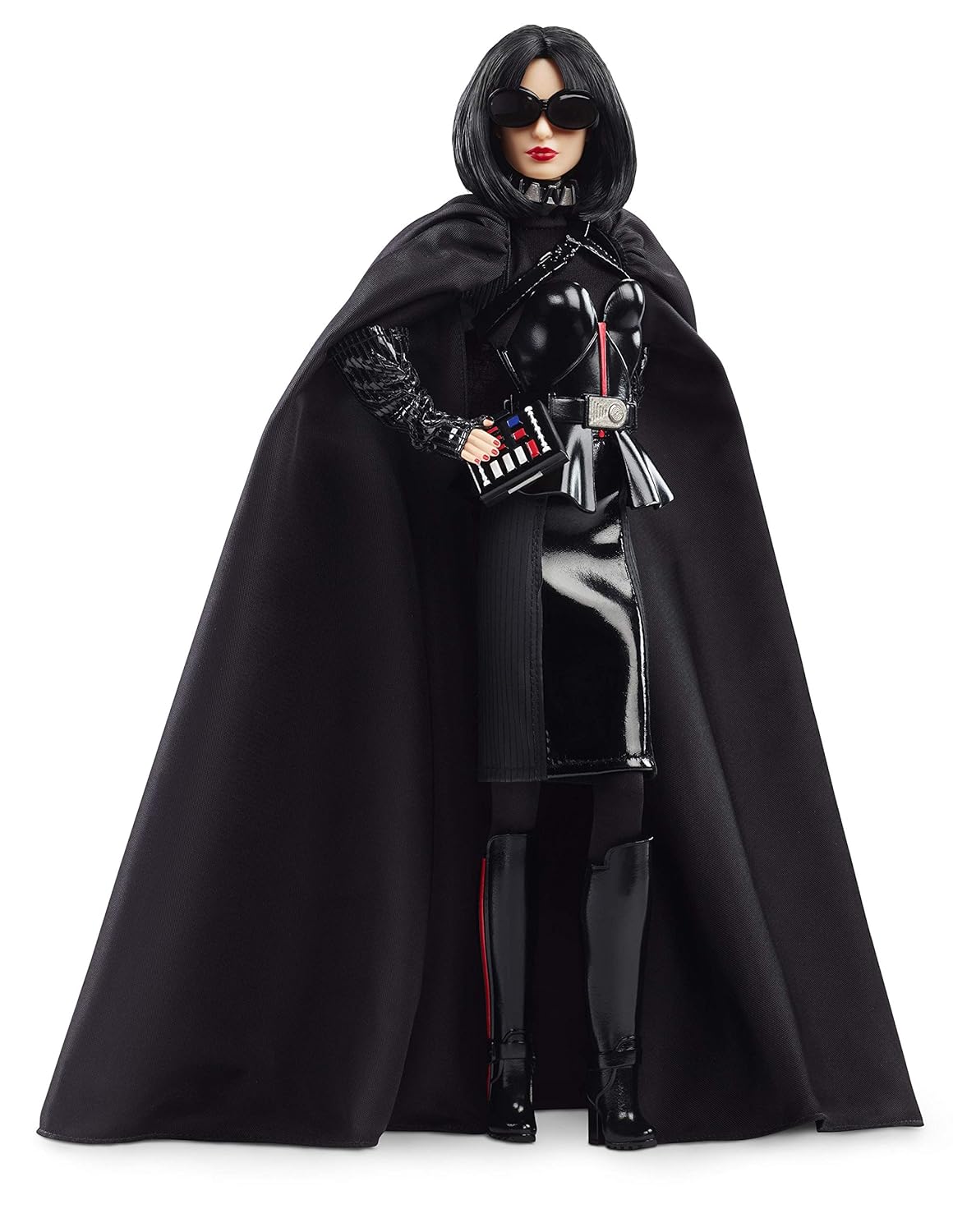 Barbie Darth Vader doll looks fantastic. You cannot mistake her for any other character! She is wearing an all-black outfit inspired by a Sith armor. She wears a shiny-black peplum top, panelled pencil skirt, knee-high boots and a black cape. Her black sunglasses combined with her hairstyle remind me of a Darth Vader’s mask, and her purse looks similar to Vader’s breathing machine.